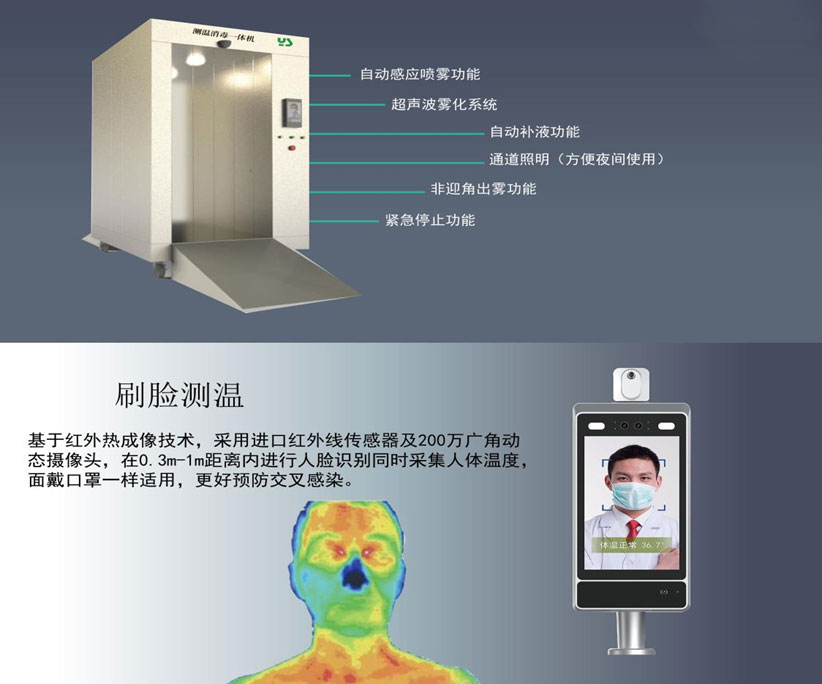 YSCX20-01A测温消毒一体机是由浙江缘森生态环境科技有限公司自主研发和生产的测温消毒产品,用于预防公共卫生事件发生,并在发生应急公共事件时,对公共空间入口通过的人进行体温测定并同时可进行表面消毒。设备运行智能控制,无需专人控制,并内嵌人脸识别软件,对进入人员进行体温登记。消毒液采用食用型消毒液,设计科学安全,不对环境产生影响。应用范围可适用于学校、社区、机场、酒店、医院等人员聚集的公共场合。